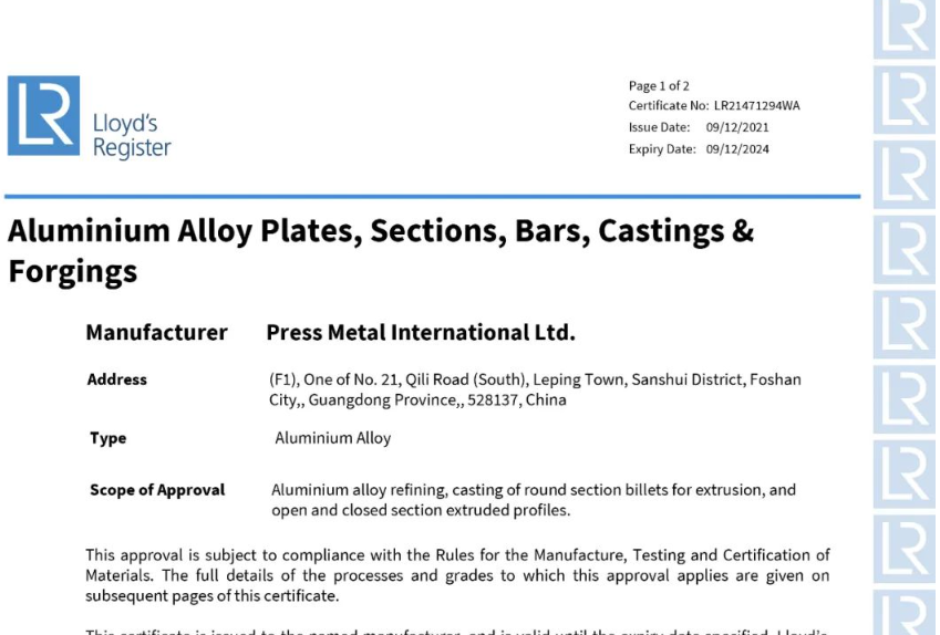 近期,澳美鋁業(yè)正式獲得英國勞氏船級社工廠認(rèn)可證書。英國勞氏船級社(Lloyd’sRegister of Shipping 縮寫LR),也譯作英國勞埃德船級社,在世界船舶界享有盛名,是國際公認(rèn)的船舶界權(quán)威認(rèn)證機(jī)構(gòu)之一。